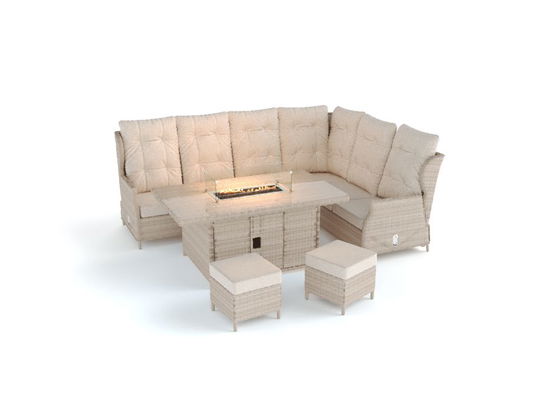 With the Bari L lounge dining table set from the Country Collection, you can give your outdoor area the unique charm of exclusivity. The 7-piece group consists of two 2-seater sofas, an armless sofa and a corner unit, as well as a fire table and two stools that you can use variably. The 2-seater sofas have adjustable backrests and offer maximum comfort. The fire table can be used for decorative lighting of terraces and gardens as well as a source of heat. It operates with an output of 14.7 kW and is supplied by gas cylinders. Of course, you can also close the fireplace if necessary, so that you can enjoy a smooth, uninterrupted dining surface. There is a practical storage space for the gas bottle underneath the tabletop.