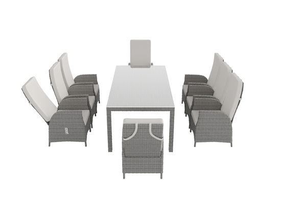 The mottled grey rattan surface immediately catches the eye. A sturdy aluminium frame is concealed directly underneath. This exquisite table group combines luxury, elegance and comfort in the most beautiful way. The transparent glass top on the tabletop is easy to clean and reliably protects the rattan from all kinds of soiling. Give your outdoor area a stylish ambience. The Ceres Relax dining table set from the New Classics Collection is available in sizes S, M, L, XL and XXL..
