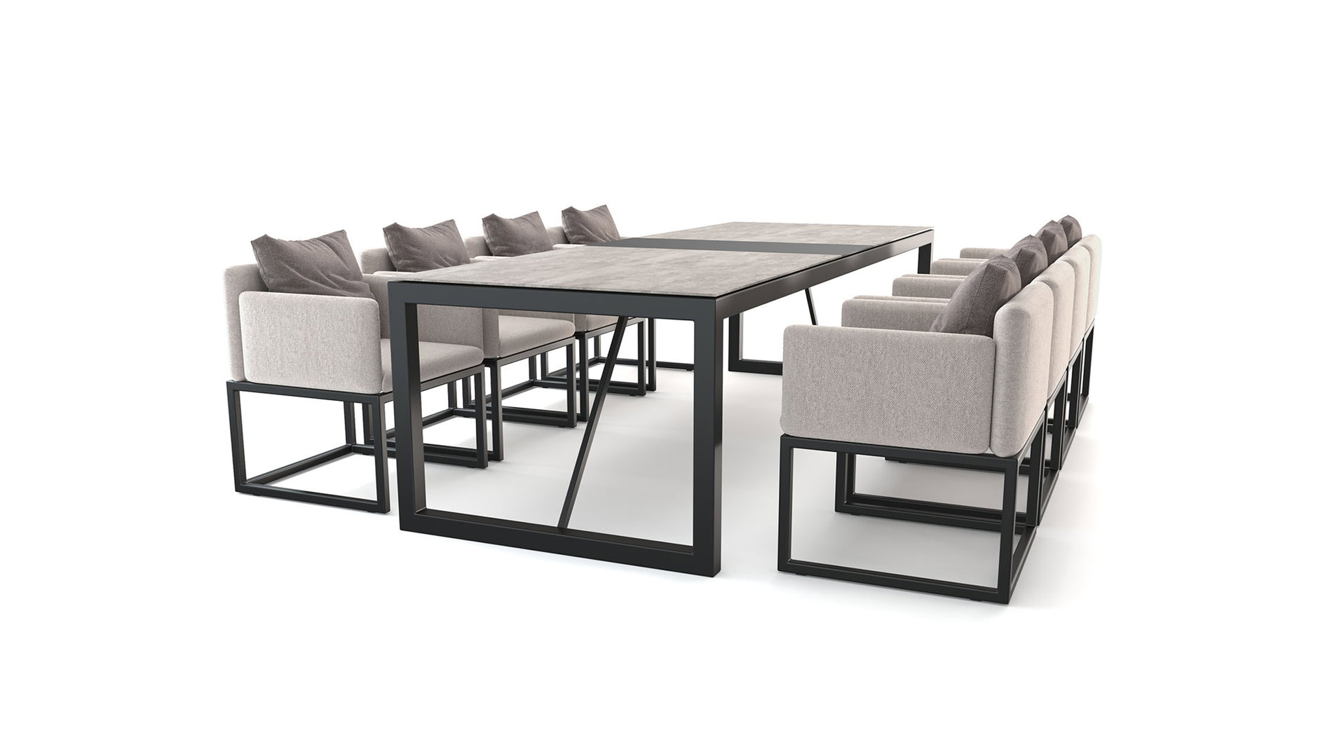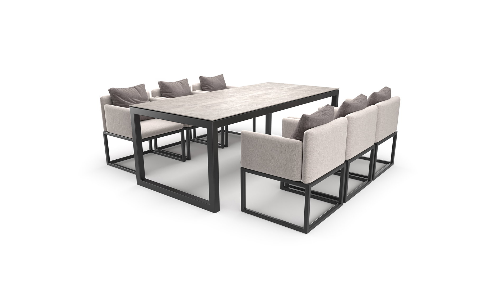 Das Herzstück dieses Sets ist ein geräumiger Tisch, der Platz für bis zu 8 Gäste bietet. Sein Aluminiumrahmen in Anthrazit unterstreicht die edle Ästhetik und gewährleistet Langlebigkeit. Die Tischplatte mit ihrem exquisiten Keramikeffekt ist nicht nur ein optischer Höhepunkt, sondern auch äußerst pflegeleicht und robust – perfekt für Ihre geselligen Abende im Freien.
