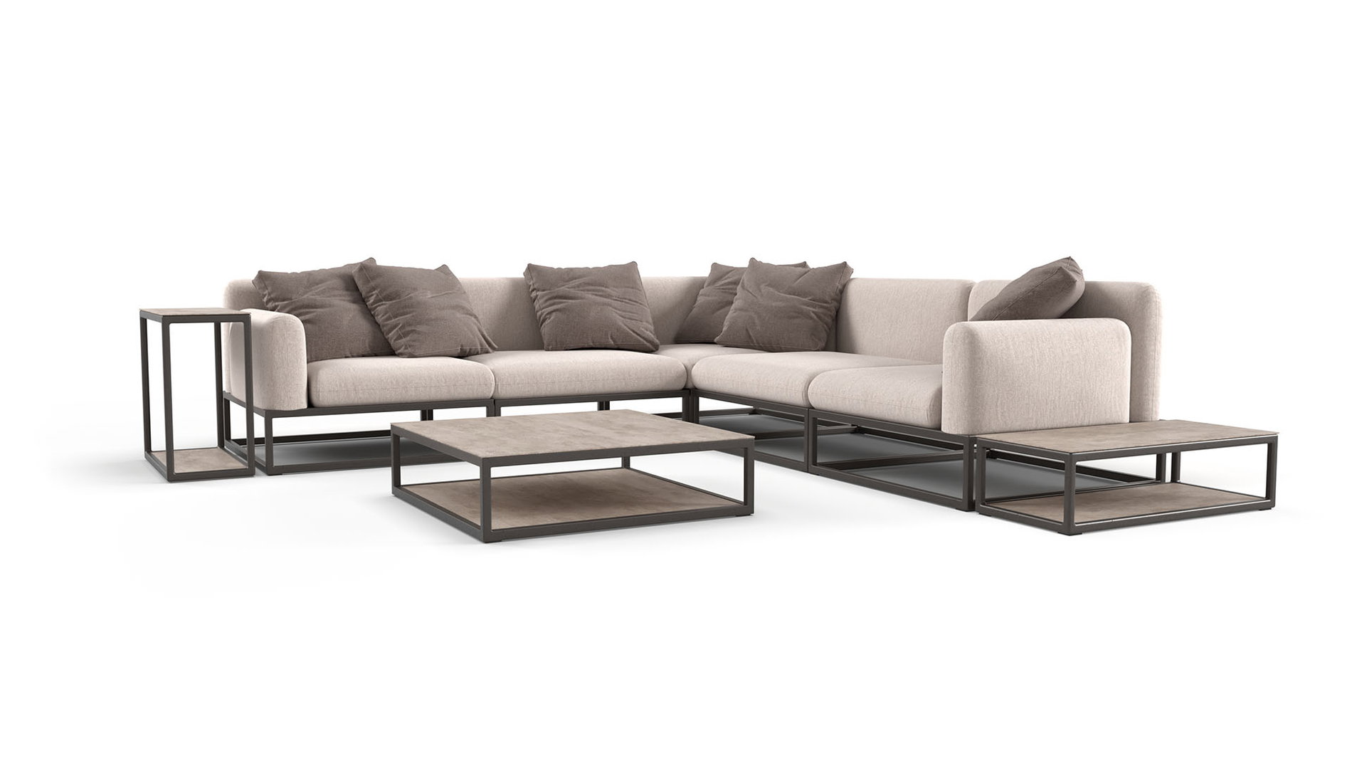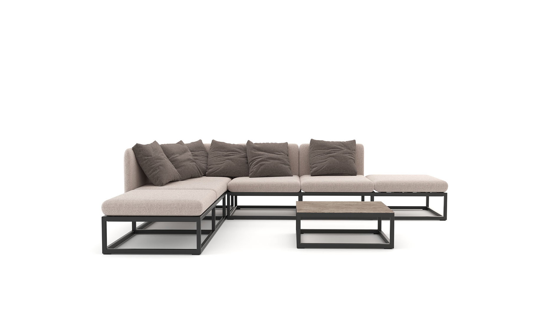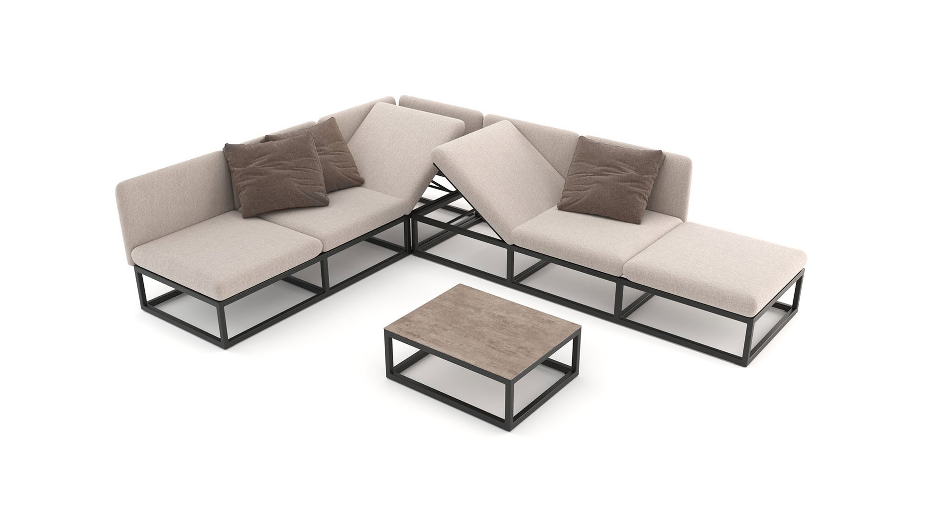 Modernes Lounge Set aus Aluminium und Olefin, das flexible Arrangements ermöglicht. Soyo L bietet luxuriösen Komfort und vielseitige Kombinationsmöglichkeiten, ideal für entspannte Liegeflächen oder gesellige Treffen auf Ihrer Terrasse.
