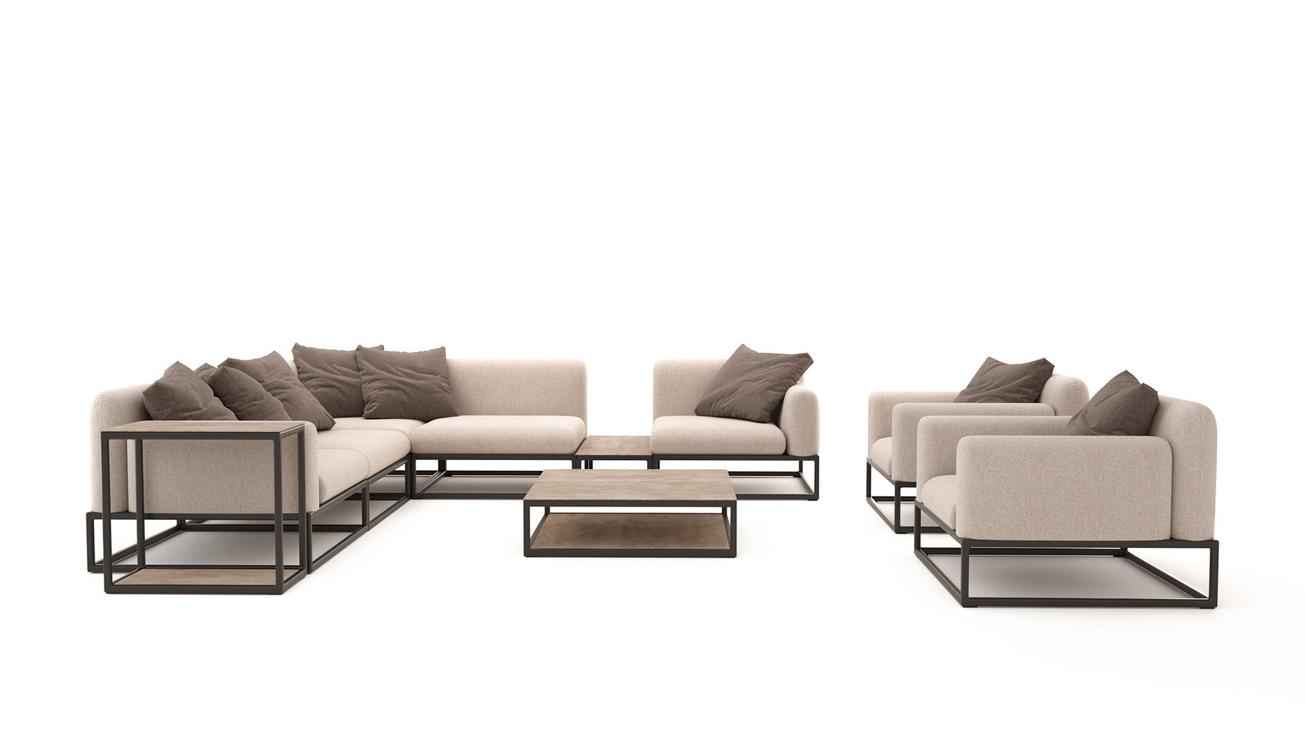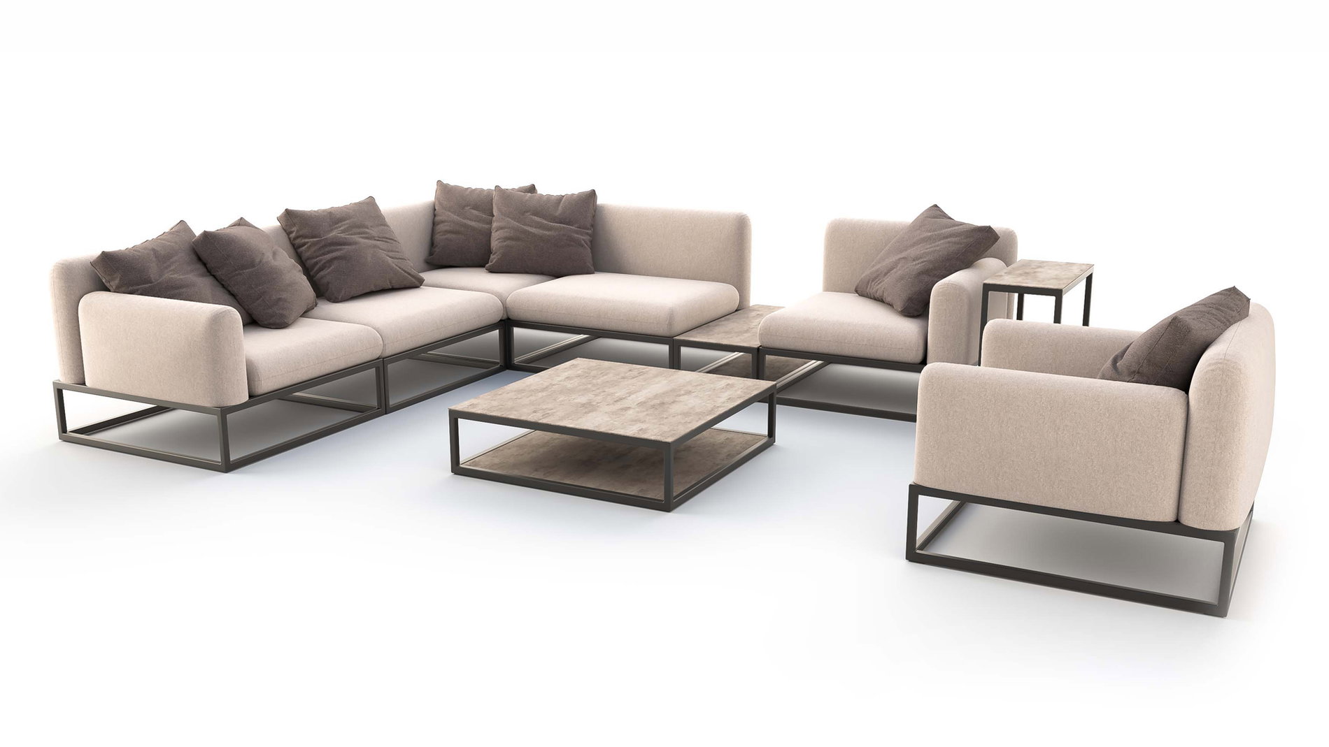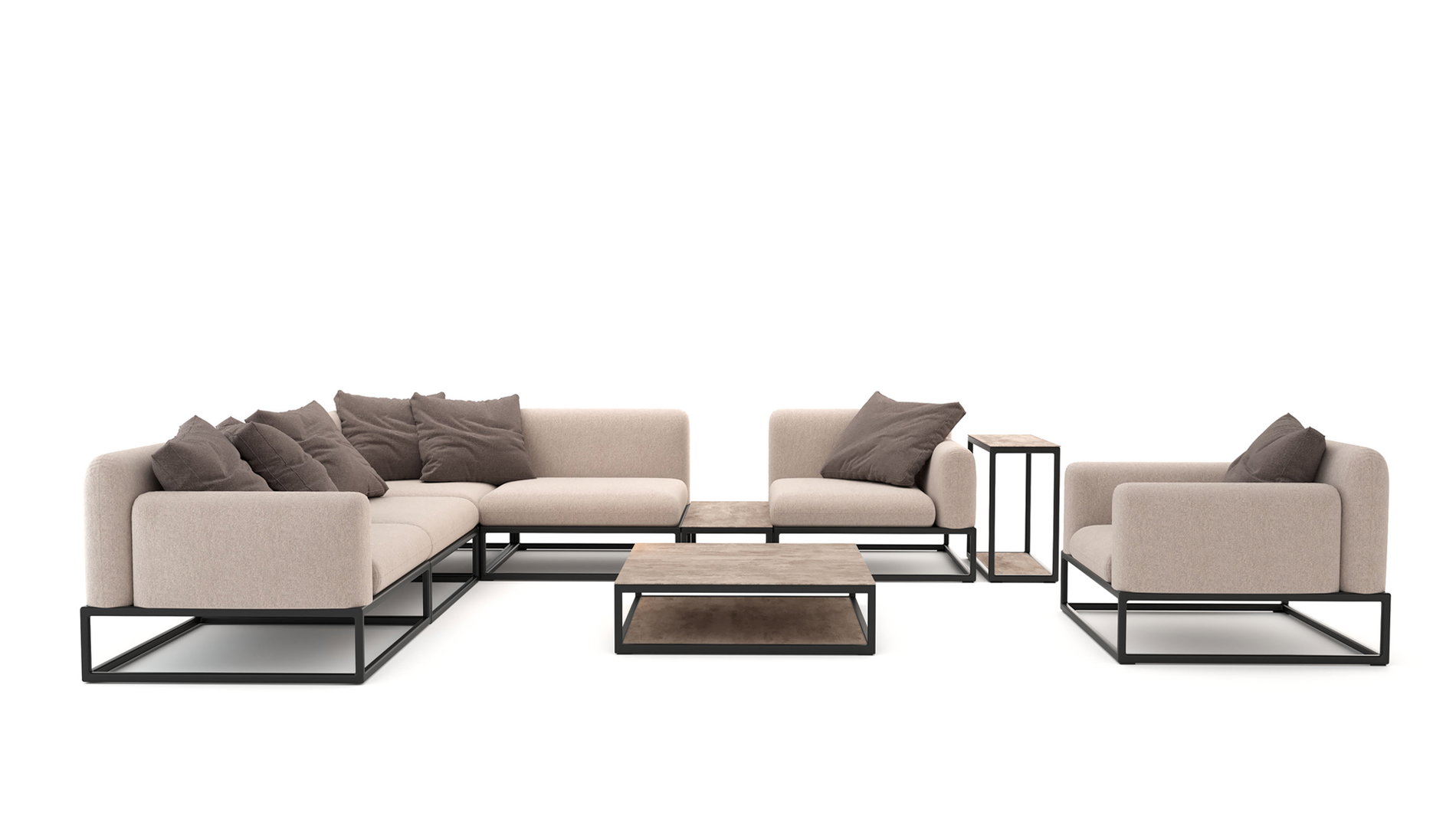 Modernes Lounge Set aus Aluminium und Olefin, das flexible Arrangements ermöglicht. Soyo L bietet luxuriösen Komfort und vielseitige Kombinationsmöglichkeiten, ideal für entspannte Liegeflächen oder gesellige Treffen auf Ihrer Terrasse.