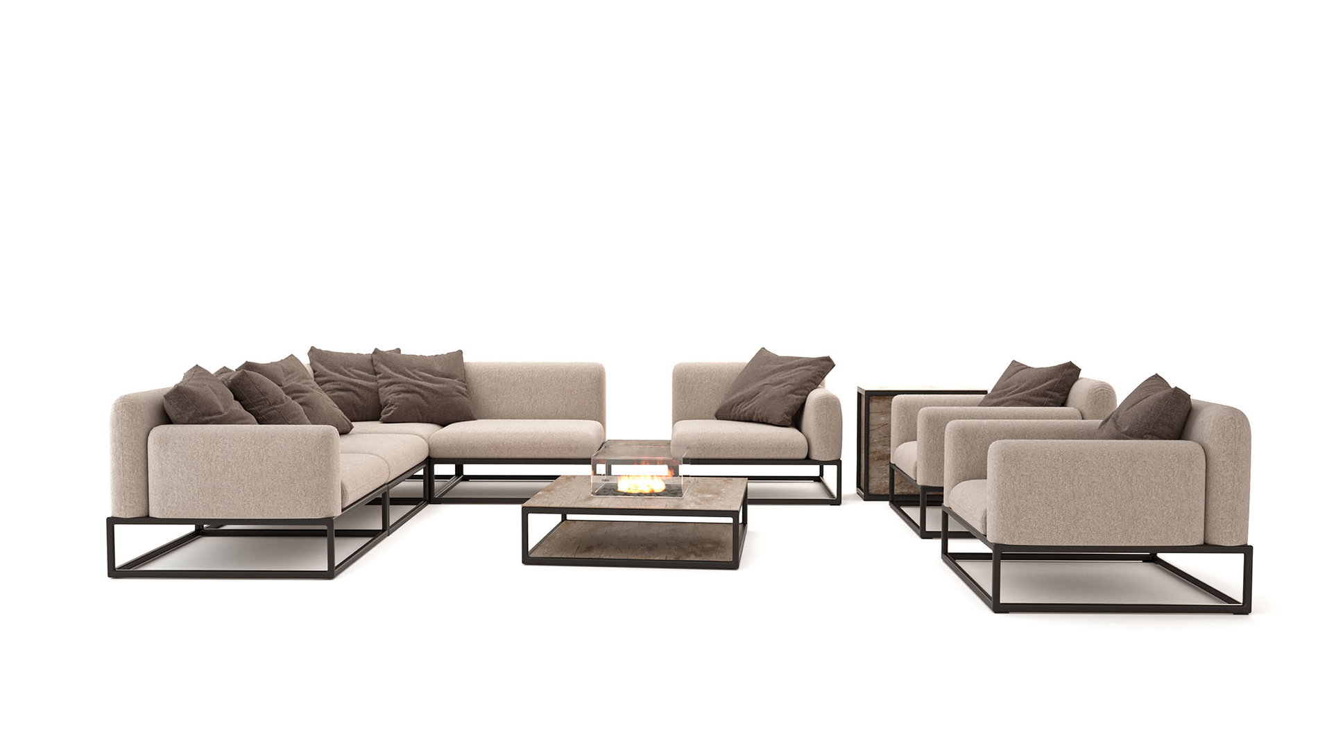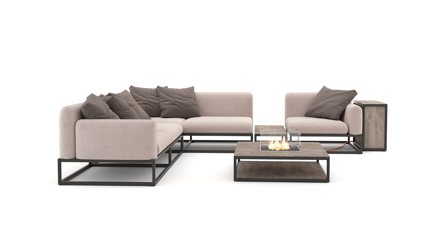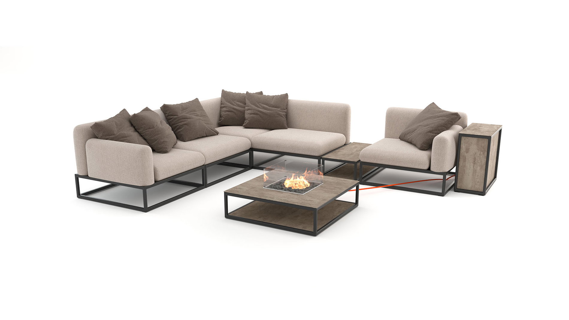 Im Flammenschein den Tag ausklingen lassen: Das Soyo L Lounge Set mit Feuertisch verwandelt Ihre Terrasse in ein gemütliches Wohnzimmer im Freien. Flexibel arrangierbar, ideal für Entspannung und gesellige Treffen.