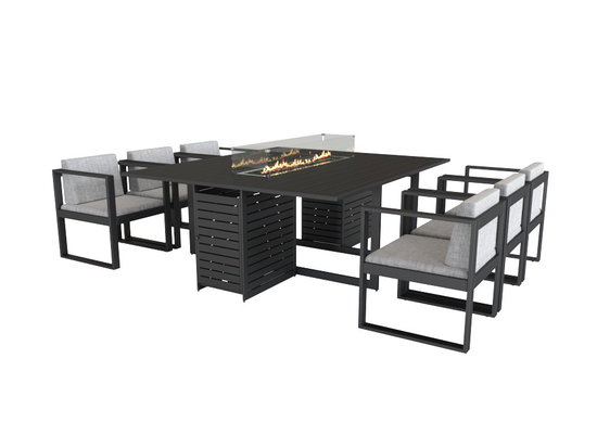 Cool elegance and a very special charm characterise the dining table set Ricardo with its accompanying Fire Table. The group from our ever-popular Sleek Line consists of six luxurious armchairs that can be pushed completely under the table. The dining fire table can be used for decorative lighting of terraces and gardens as well as a source of heat. In the middle is a romantic, comforting fireplace surrounded by safety glass on all four sides. The flickering flames give your summer party a cosy feeling of intimacy. When the fireplace is not needed, it can be closed with a plate to create an uninterrupted surface. The fire table operates with an output of 14.7 kW and is supplied by gas bottles.