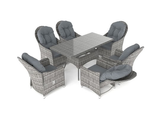 A roomy, oval-shaped table and six comfortable chairs – our luxurious LIVIA L Dining Set! The perfect dining set for all those summer nights in the garden. There’s even a hole in the middle for a parasol, should you want some shade from the hot afternoon sun. Check out our ‘parasols’ section! It would also be ideal for your conservatory, if the rain comes on. The elegant mixed grey rattan and cushion covers will complement any garden. The table comes with a 5mm thick safety glass table top. There’s plenty of room for afternoon tea or a breakfast buffet! Need more space? Not to worry, LIVIA L has a big sister – LIVIA XL – that comes with a bigger table and 8 seats. The frame of the set is made from powder-coated aluminium and the synthetic rattan is weather-proof. The cushions comply with UKFR (UK fire regulations).